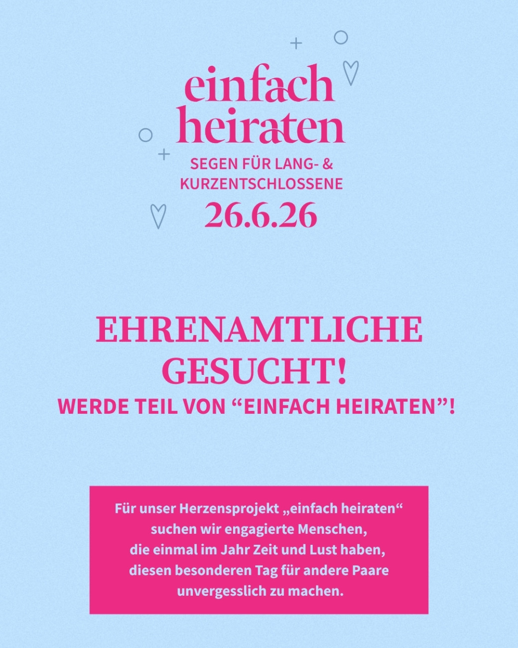 FĂŒr unser Herzensprojekt âeinfach heiratenâ suchen wir engagierte Menschen, die einmal im Jahr Zeit und Lust haben, diesen besonderen Tag fĂŒr andere Paare unvergesslich zu machen.